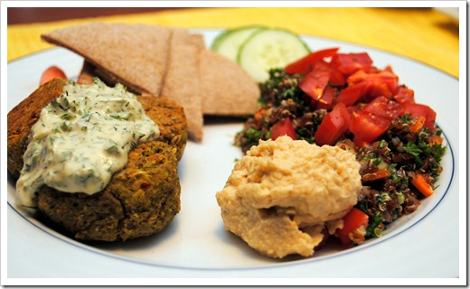 Falafel feast with dilly tzatziki, hummus, quinoa tabouli, whole wheat pita, and fresh sliced cucumber, carrots, and celery.